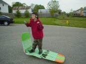Chris dancing on a lawn chair skateboard.